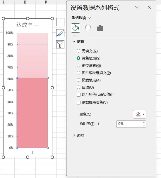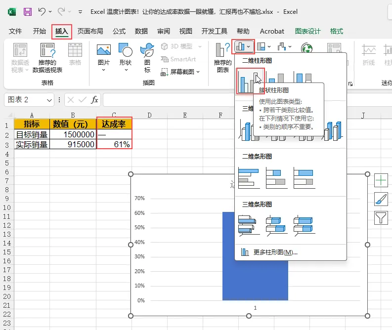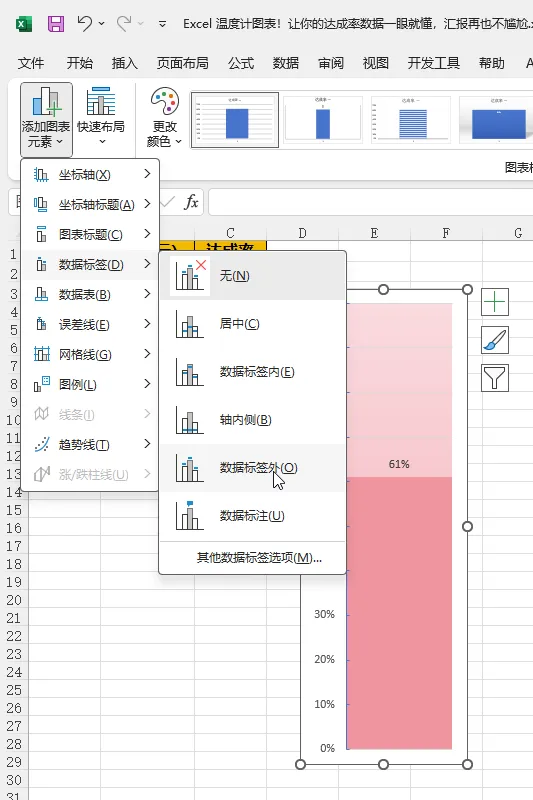 添加数据标签:单击数据柱 →【添加图表元素】→【数据标签】→【数据标签外】,将达成率(61%)显示在柱子中。