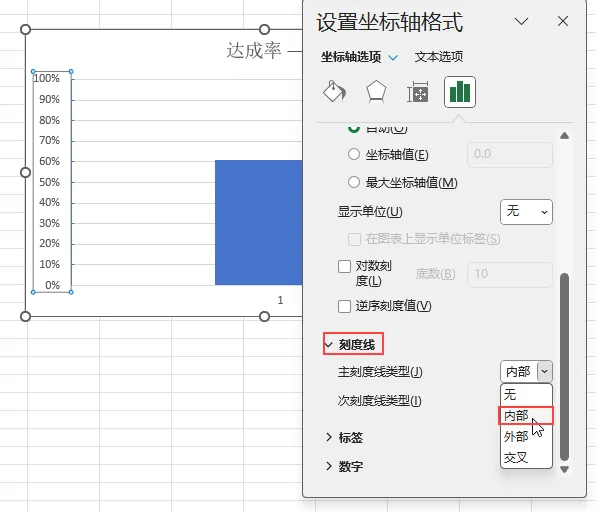 「主要类型」选择 内部,让刻度线显示在坐标轴内侧,更贴近真实温度计的样式。