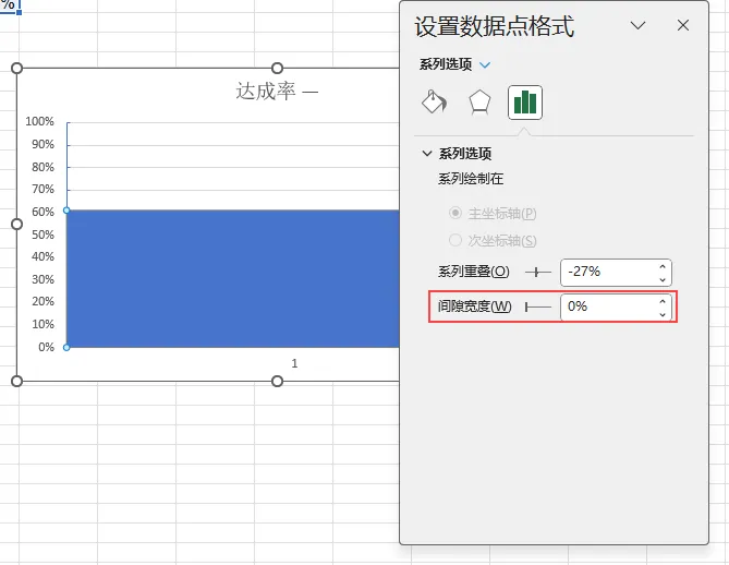 找到「分类间距」,将数值调整为 0%,让数据柱填满整个图表宽度,模拟温度计的 “液柱”。