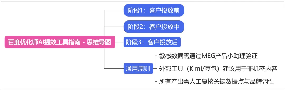 别急。这份《百度优化师AI提效工具指南》已经把投前、投中、投后三个阶段的工作节奏拆解得明明白白。跟着节奏走,用对AI工具,你的工作效率至少提升50%以上。用对AI工具,3天工作1天完成,客户满意度翻倍。
