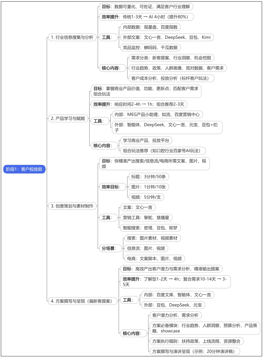 投前阶段的核心是“准”。客户还没开口,你心里已经有谱。这个阶段AI能帮你把准备周期从原来的5-7天压缩到2-3天。