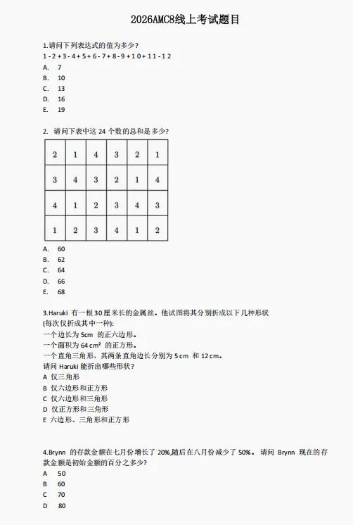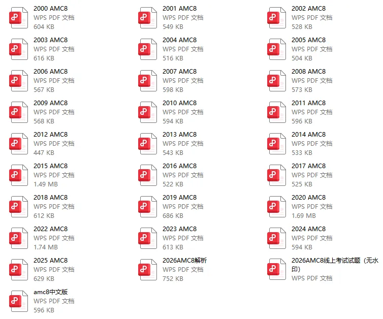 AMC8竞赛历年真题+答案解析,高清PDF打印! 备考AMC8数学竞赛,AMC8真题是少不了的!Lily老师已经将AMC8竞赛真题整理好了,可以文末领取。 AMC8数学竞赛历年真题(2000-2026) AMC8数学竞赛真题展示 篇幅有限,AMC8数学竞赛真题 关注公众号,回复【777】领取