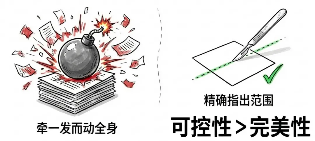 这是保证“可控性”的核心。AI最容易闯的祸就是“牵一发而动全身”,改一行代码,污染了十个文件。