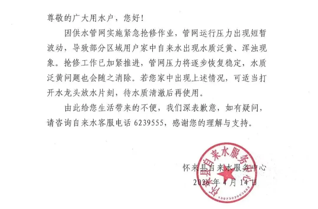 【说明】怀来城区部分业主家中自来水浑浊!?怀来供水官方说明来了…
