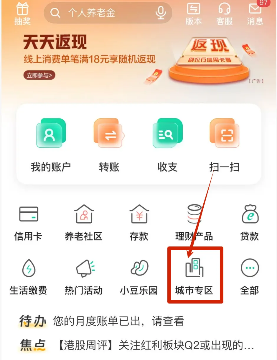 在首页搜索栏输入“城市专区”,进入对应页面