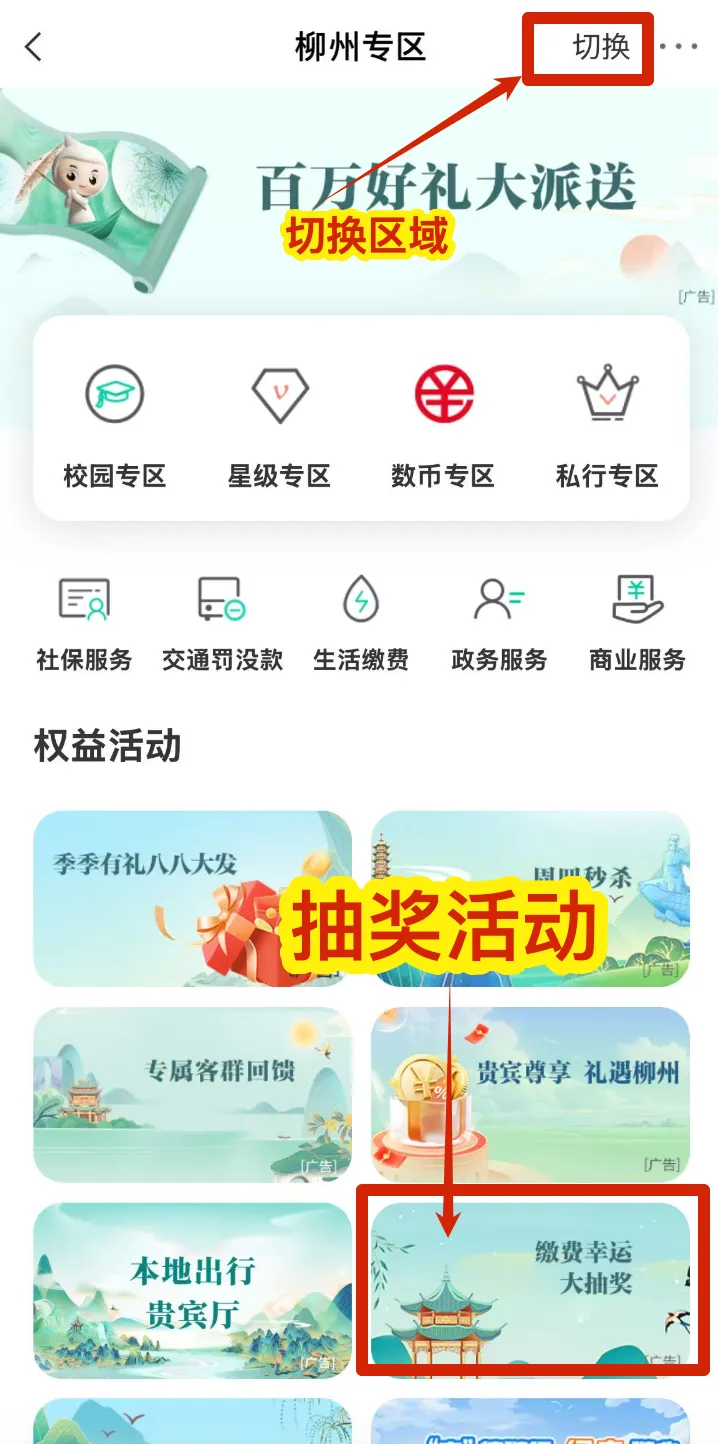 地区切换操作:必须将城市专区内的地区手动切换为柳州,否则无法触发对应活动页面 -