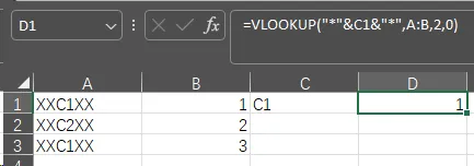=VLOOKUP("*"&C1&"*",A:B,2,0)