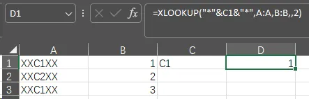 =XLOOKUP("*"&C1&"*",A:A,B:B,,2)