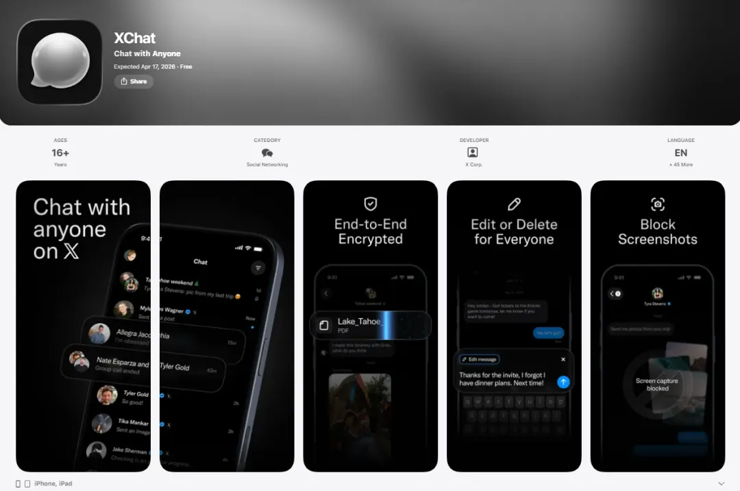 如果只看表面,XChat 像是一个“更安全的聊天工具”。但把公开信息拼起来看,它更像是 X 在重新定义自己的通信入口。App Store 页面显示,XChat 是 X Corp. 推出的独立社交应用,面向 iPhone 和 iPad,预计在2026 年 4 月 17 日上线,目前已经可以预订;页面还明确写着它是一个“私密、专注”的聊天空间,并强调无广告、无追踪、端到端加密。这件事值得看,不是因为“又多了一个聊天 App”,而是因为 X 终于把私信从主应用里拎出来,单独做成一个产品。Business Standard 的报道写得很直白:XChat 这次不是简单升级原有 DM,而是从 X 的现有私信体系里抽离出来,变成独立应用;9to5Mac 也确认,它会先在 iPhone 和 iPad 上推出,App Store 预览里能看到 4 月 17 日的发布日期。