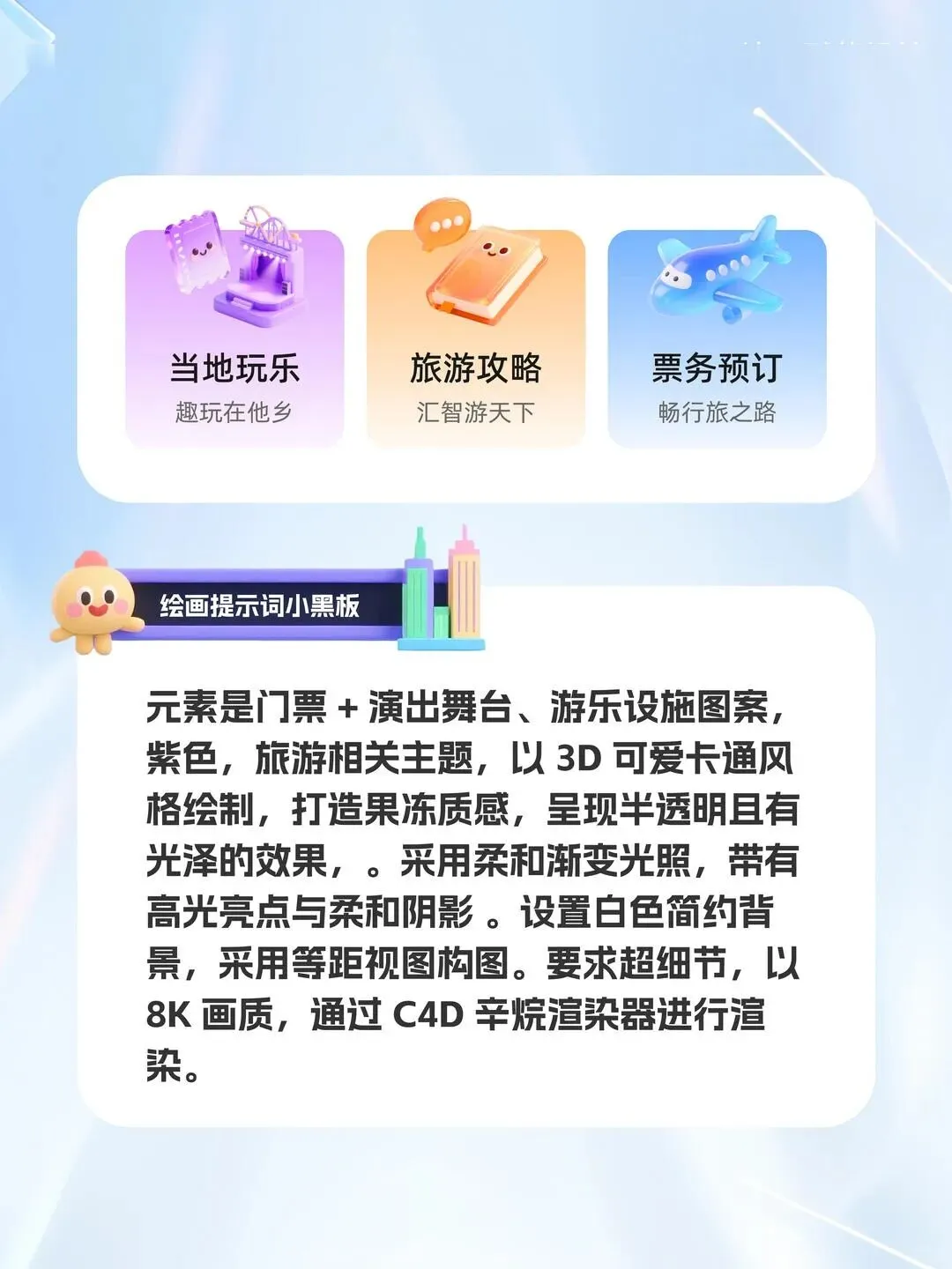 元素是门票 + 演出舞台、游乐设施图案,旅游相关主题,以3D可爱卡通风格绘制,打造果冻质感,呈现半透明且有光泽的效果。采用柔和渐变光照,带有高光亮点与柔和阴影。设置白色简约背景,采用等距视图构图。要求超细节,以8K画质,通过C4D辛烷渲染器进行渲染。