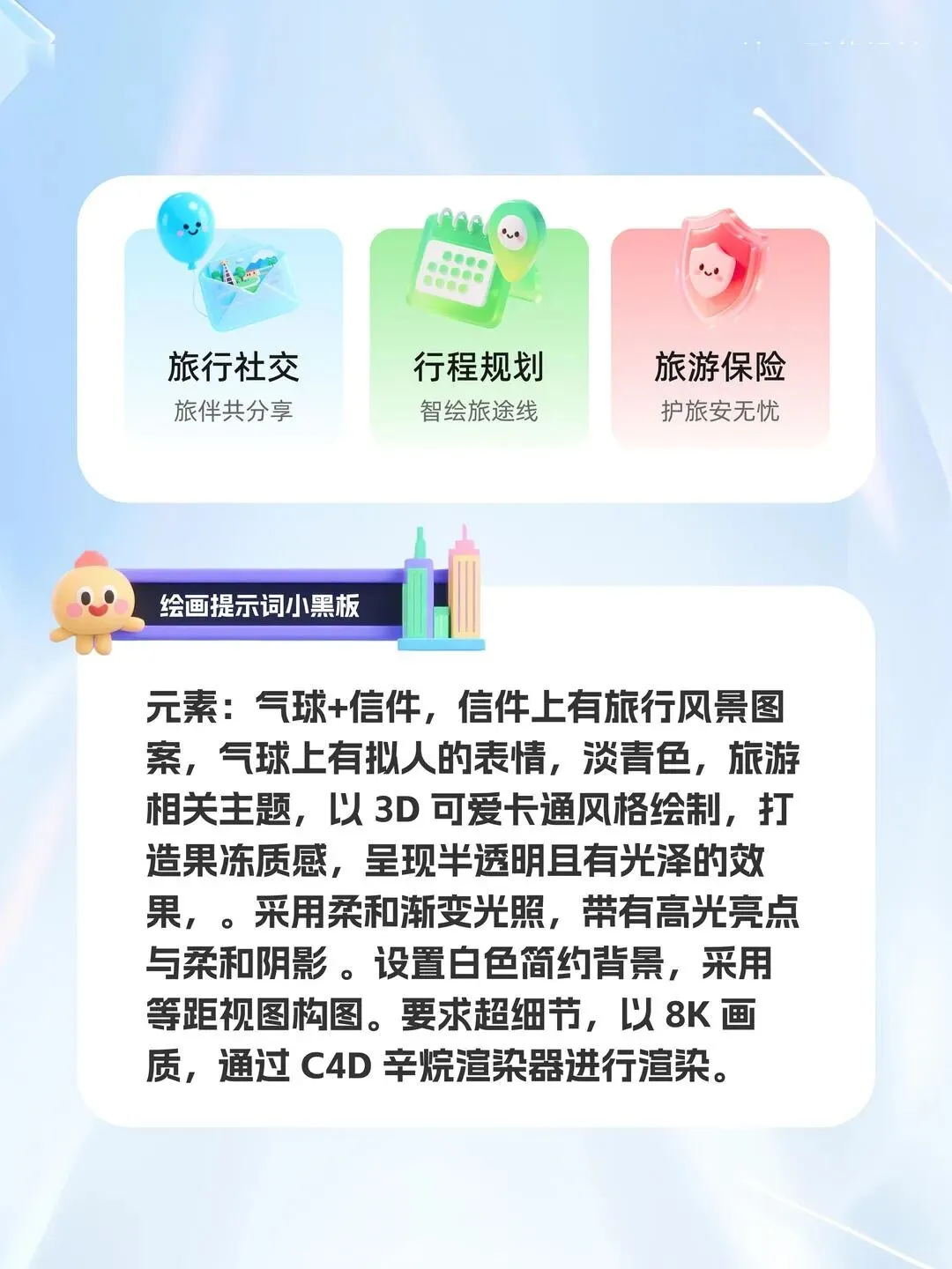 元素:气球+信件,信件上有旅行风景图案,气球上有拟人的表情,旅游相关主题,以3D可爱卡通风格绘制,打造果冻质感,呈现半透明且有光泽的效果。采用柔和渐变光照,带有高光亮点与柔和阴影。设置白色简约背景,采用等距视图构图。要求超细节,以8K画质,通过C4D辛烷渲染器进行渲染。