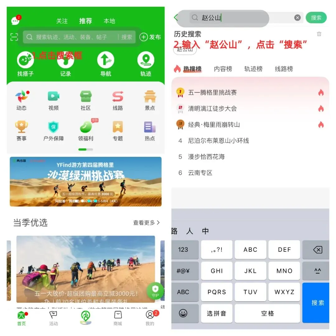 ①打开两步路APP,进入首页,点击顶部搜索框,输入具体路线名称(如“赵公山”),点击“搜索”按钮;