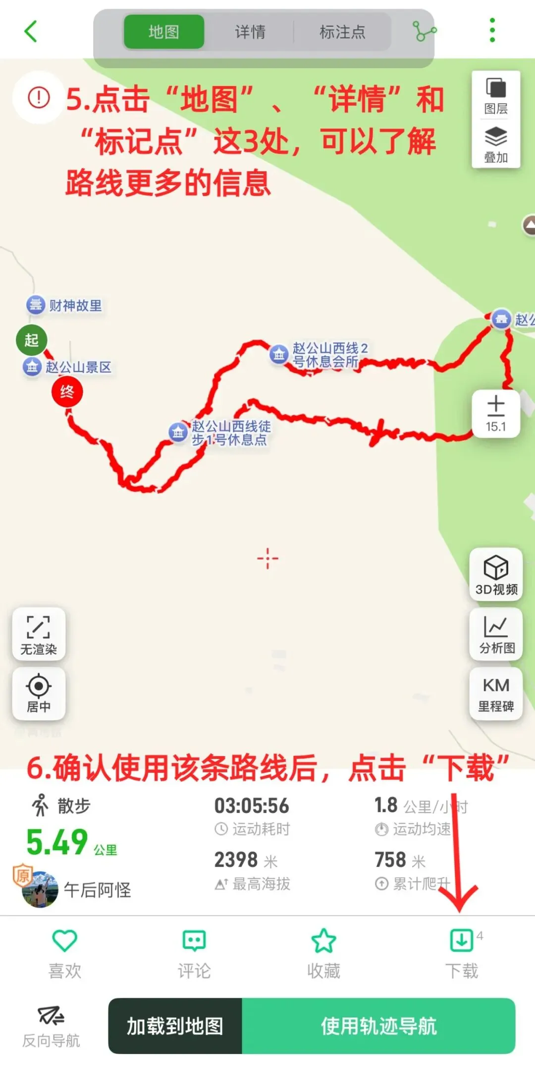 ③选好轨迹后,点击进入即可查看更详细的信息,如路况、耗时、爬升等,确认合适后点击“下载”;