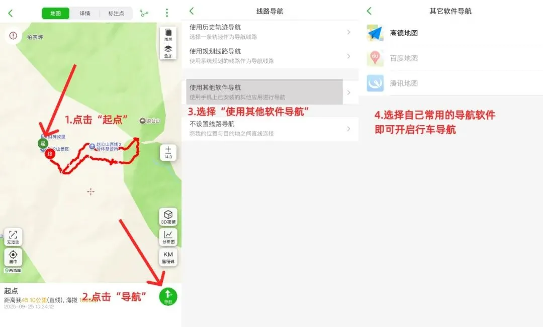①打开轨迹,点击路线起点,可以跳转使用导航软件,导航至徒步起点;
