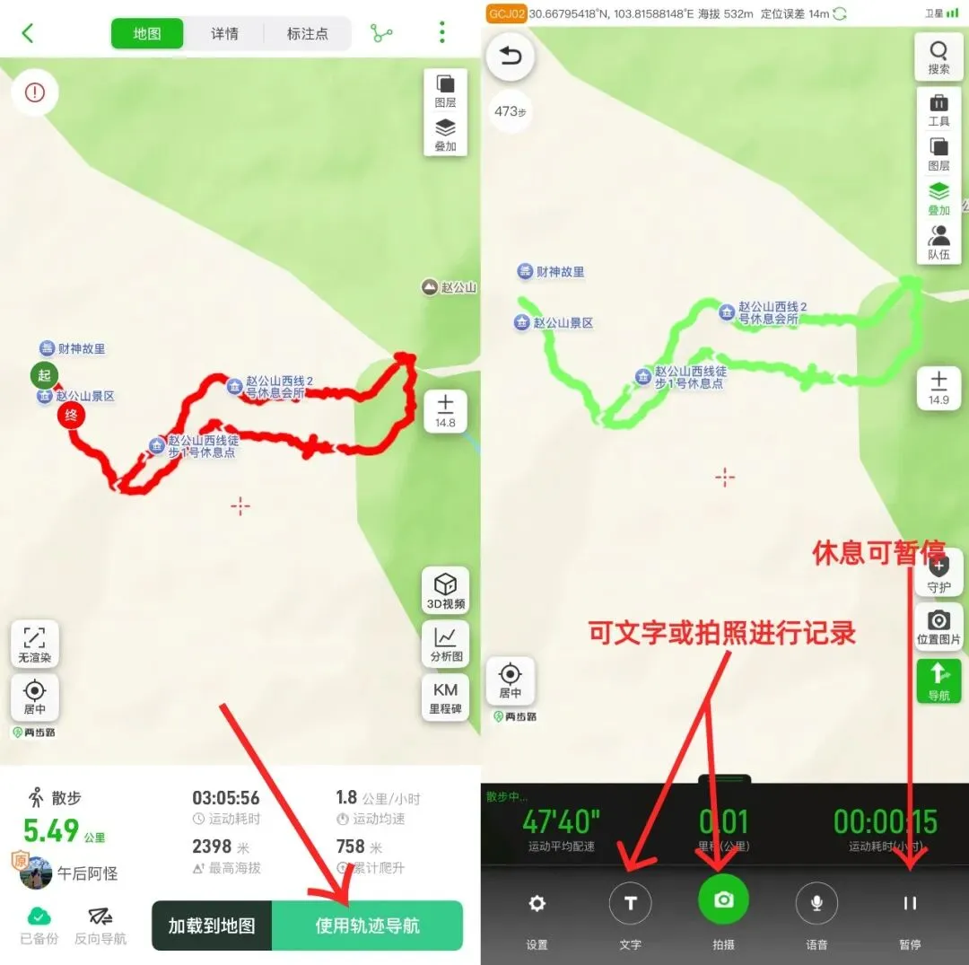 ⚠️务必实时核对:行进过程中,将软件导航界面与实际路况对比,遇到岔路口、陡坡等关键位置,及时确认轨迹方向,避免偏离路线。