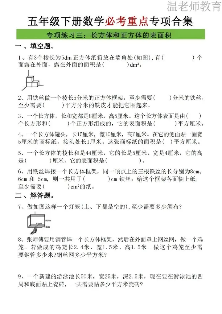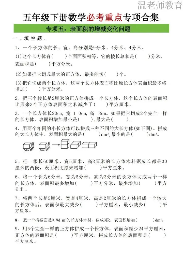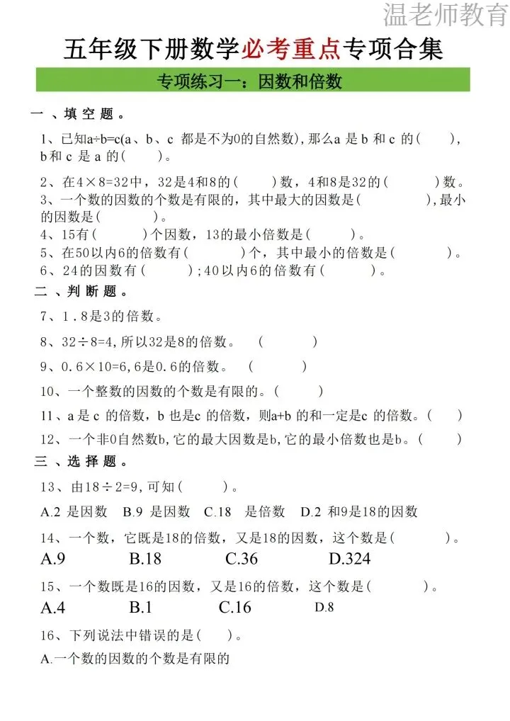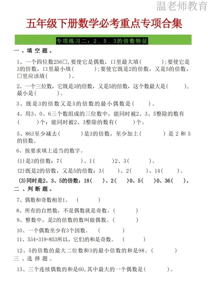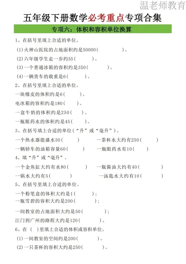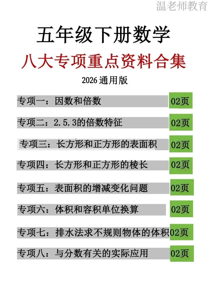 26年人教版五年级下册数学《八大重点专项合集》,这份人教版子五年级下册数学八大重点专项合集,一共17页,涵盖了五年级下册数学八大必考重点专项,每一类都是考试拉分题、高频题,帮孩子吃透知识点,轻松拿高分,专项都搭配了方法技巧+典型练习题,从解题思路到巩固练习一站式搞定,需要的家长抓紧打印出来,让孩子每天练习起来吧。