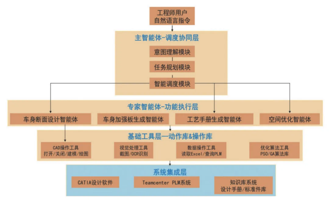 采用“主管智能体—专家智能体—基础工具层“三层递阶架构,实现认知与执行分离、通用能力与专业能力协同: