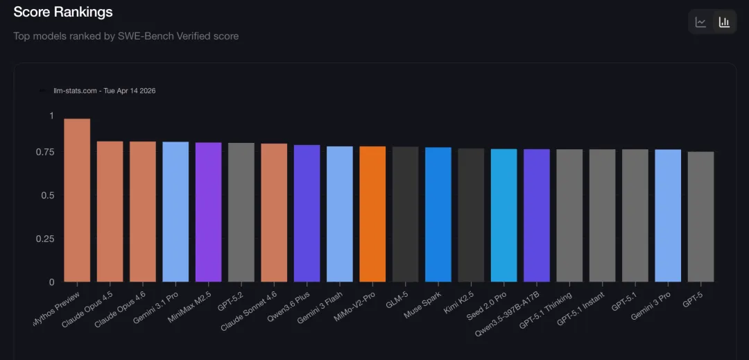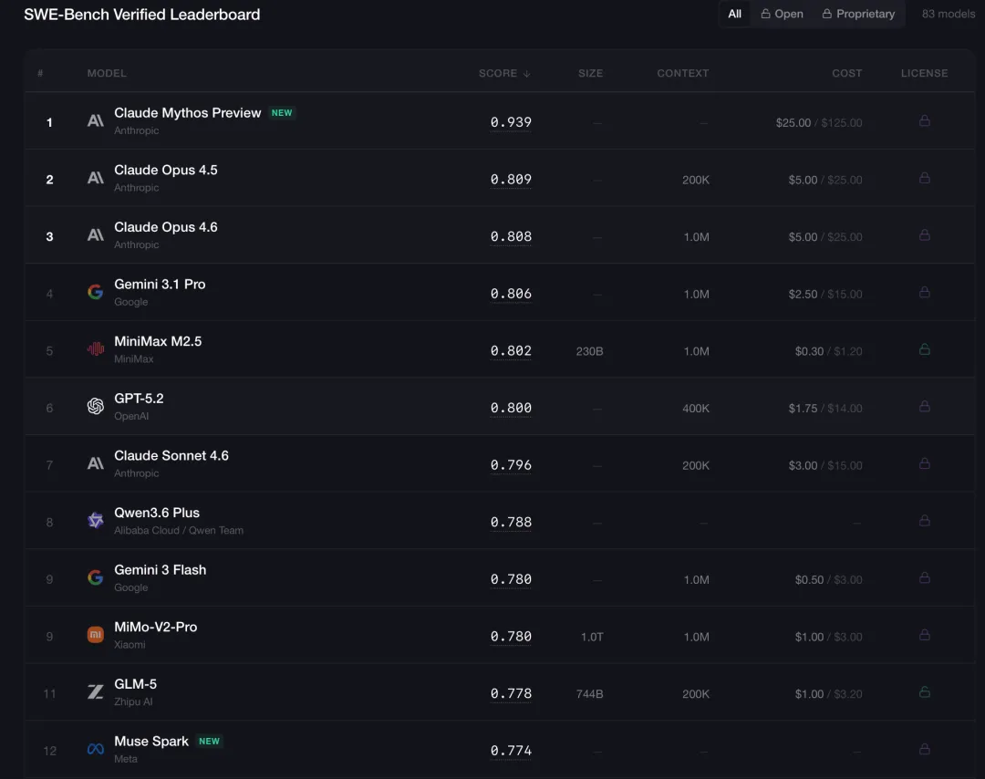 SWE-bench Verified是AI编程领域最权威的测试集,最新2026年4月数据: