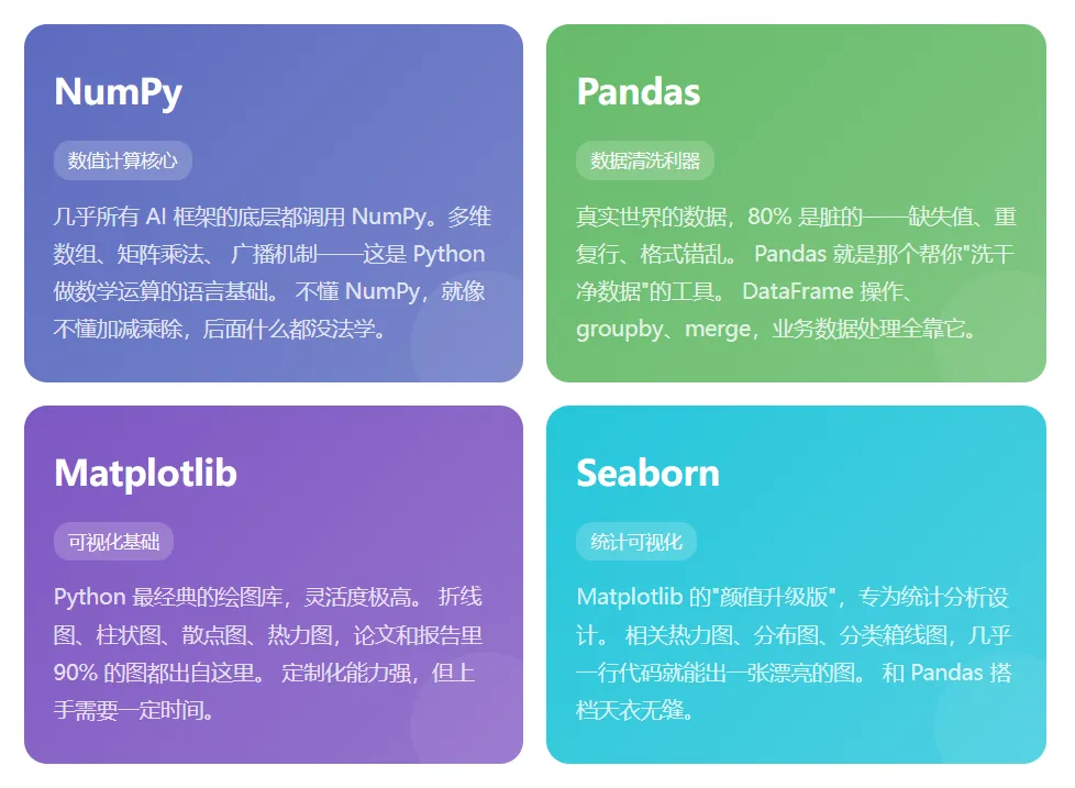 💡这四个工具的学习顺序建议是:NumPy → Pandas → Matplotlib → Seaborn。 前两个是处理数据的,后两个是展示数据的。 达到”能独立完成一份数据分析报告”的水平之后,再往深度学习方向走, 效率会高出不止一倍。