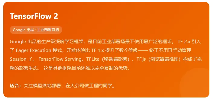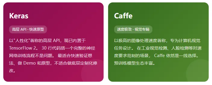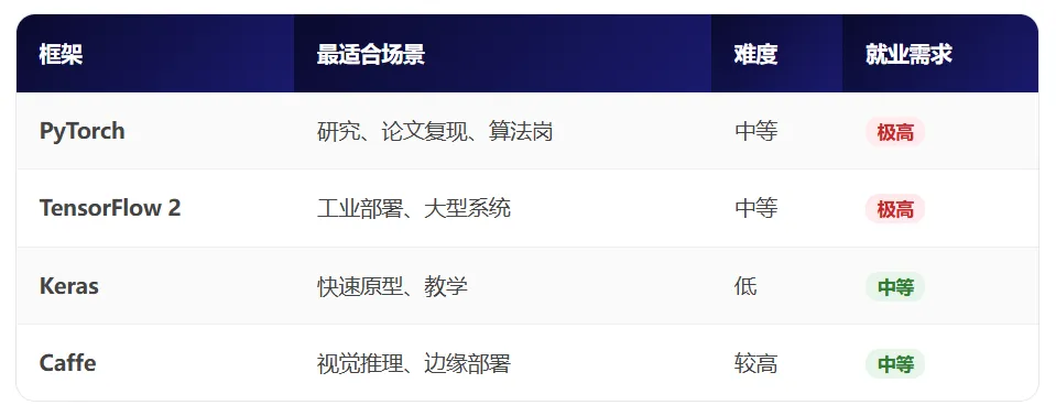 深度学习框架是”训练神经网络”的工具,也是 AI 工程师日常使用频率最高的一类工具。 目前主流的有四个:PyTorch、TensorFlow 2、Keras、Caffe。 它们各有侧重,理解清楚再做选择,比随便选一个死磕要聪明得多。