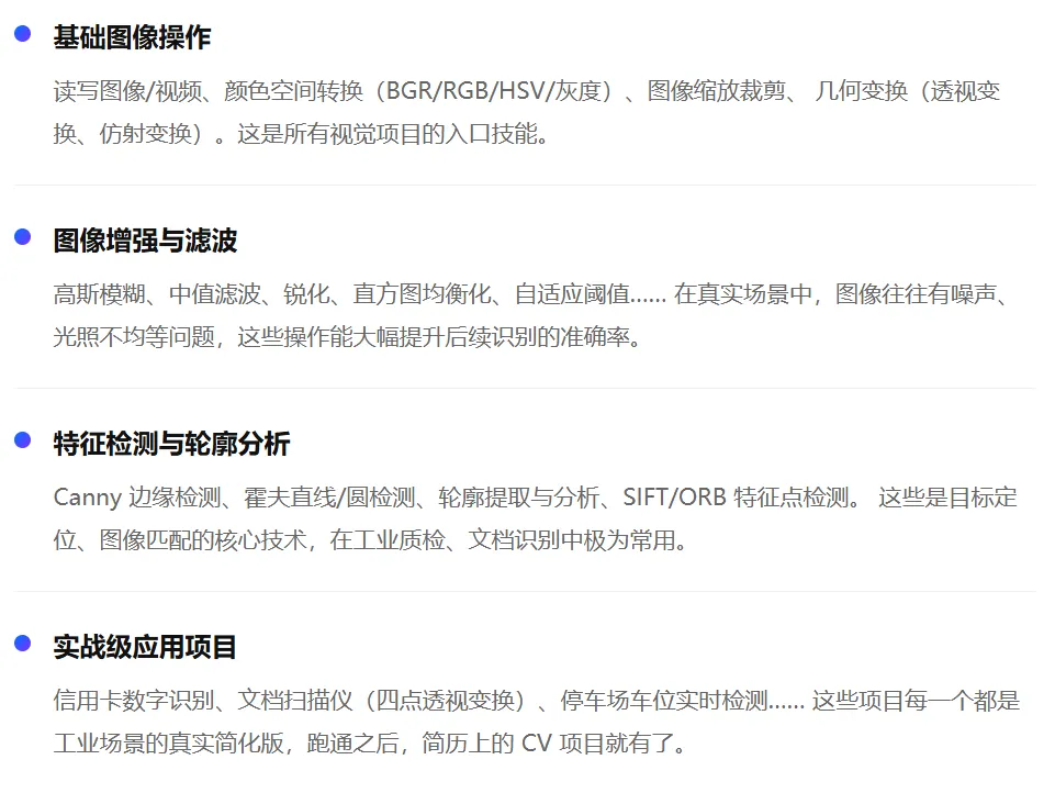 OpenCV 支持 Python 和 C++,在嵌入式设备、工业相机、无人机、机器人等场景下都有大量应用。 很多人误以为”有了深度学习就不需要 OpenCV 了”——事实恰恰相反: 深度学习处理的是”决策”,OpenCV 处理的是”图像数据本身”,两者是互补关系, 真实项目里几乎永远同时出现。