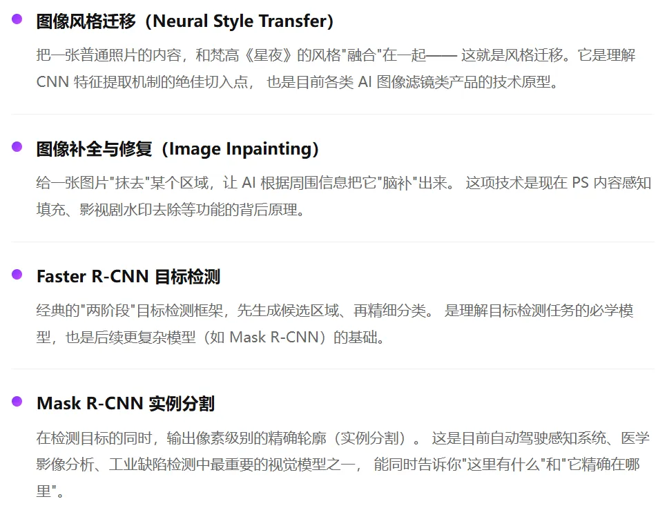 在 OpenCV 打好基础之后,计算机视觉的进阶方向是深度学习驱动的视觉任务—— 这才是近年来真正让 AI 视觉能力”爆炸式”增长的核心技术。