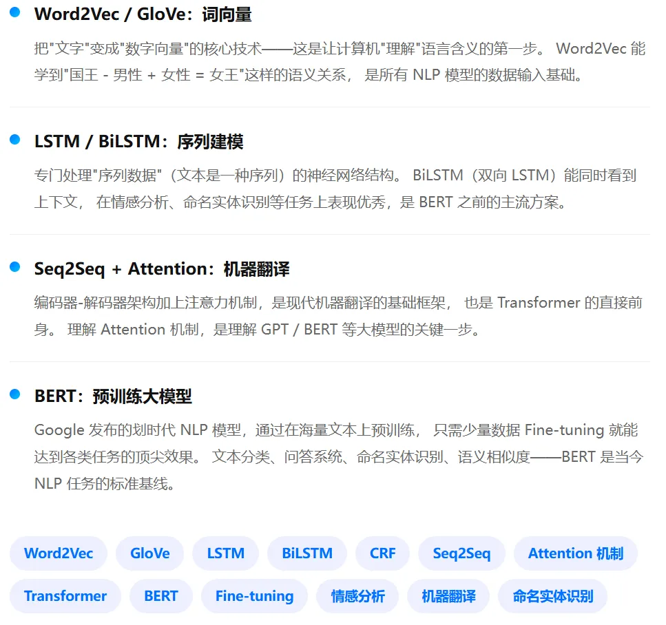 自然语言处理(NLP)是 ChatGPT、Deepseek等大语言模型的技术基础。 要真正理解这些产品背后的原理,需要从 NLP 的演进路径开始—— 从最早的词向量,到 LSTM 序列模型,再到彻底改变这一领域的 Transformer 和 BERT。