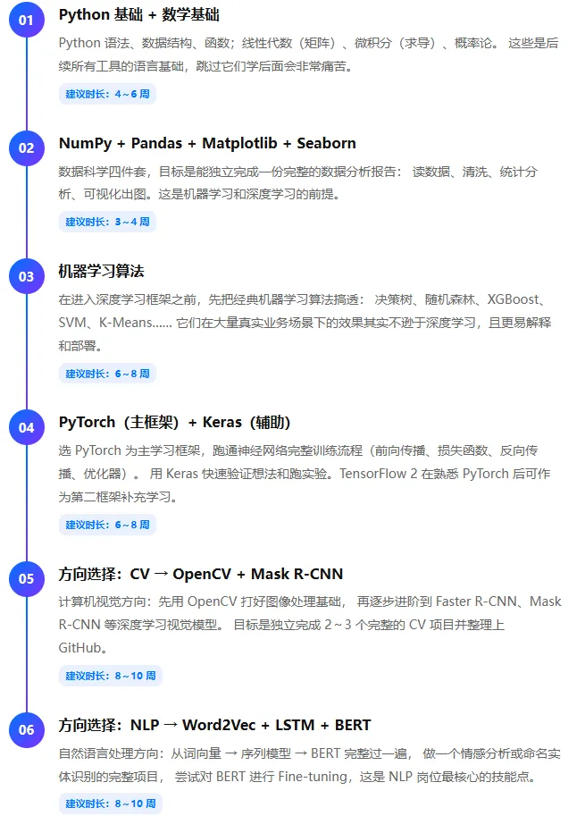 按这篇文章梳理的层次和顺序,一步一步来。 数据处理先打扎实,机器学习逻辑搞清楚,再进深度学习框架,最后走向视觉或 NLP 的具体方向。 每一层都有真实项目来检验,而不是只看文档、只刷视频。