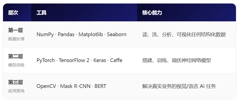 AI 的工具链,其实可以清晰地分成三个层次:数据处理层、模型训练层、应用落地层。 每一层都有它的核心工具,彼此不可替代,缺了哪一环都跑不通。