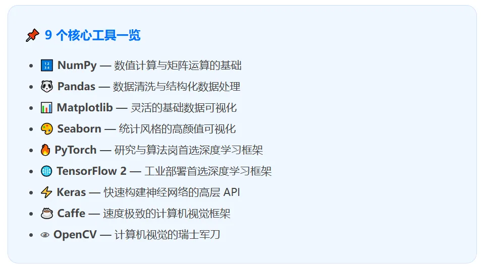 正确的姿势是:先夯实数据处理工具(NumPy + Pandas + 可视化)→ 再学模型训练框架(PyTorch / TensorFlow)→ 最后走向具体应用方向(OpenCV 做视觉,BERT 做 NLP)。 接下来,我们按这个顺序,一个一个把它们讲透。