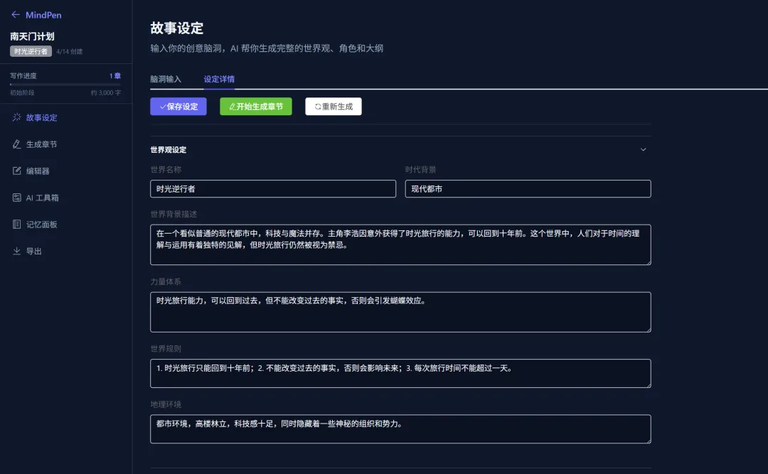 目前 MindPen 已经实现了完整的小说创作流程: