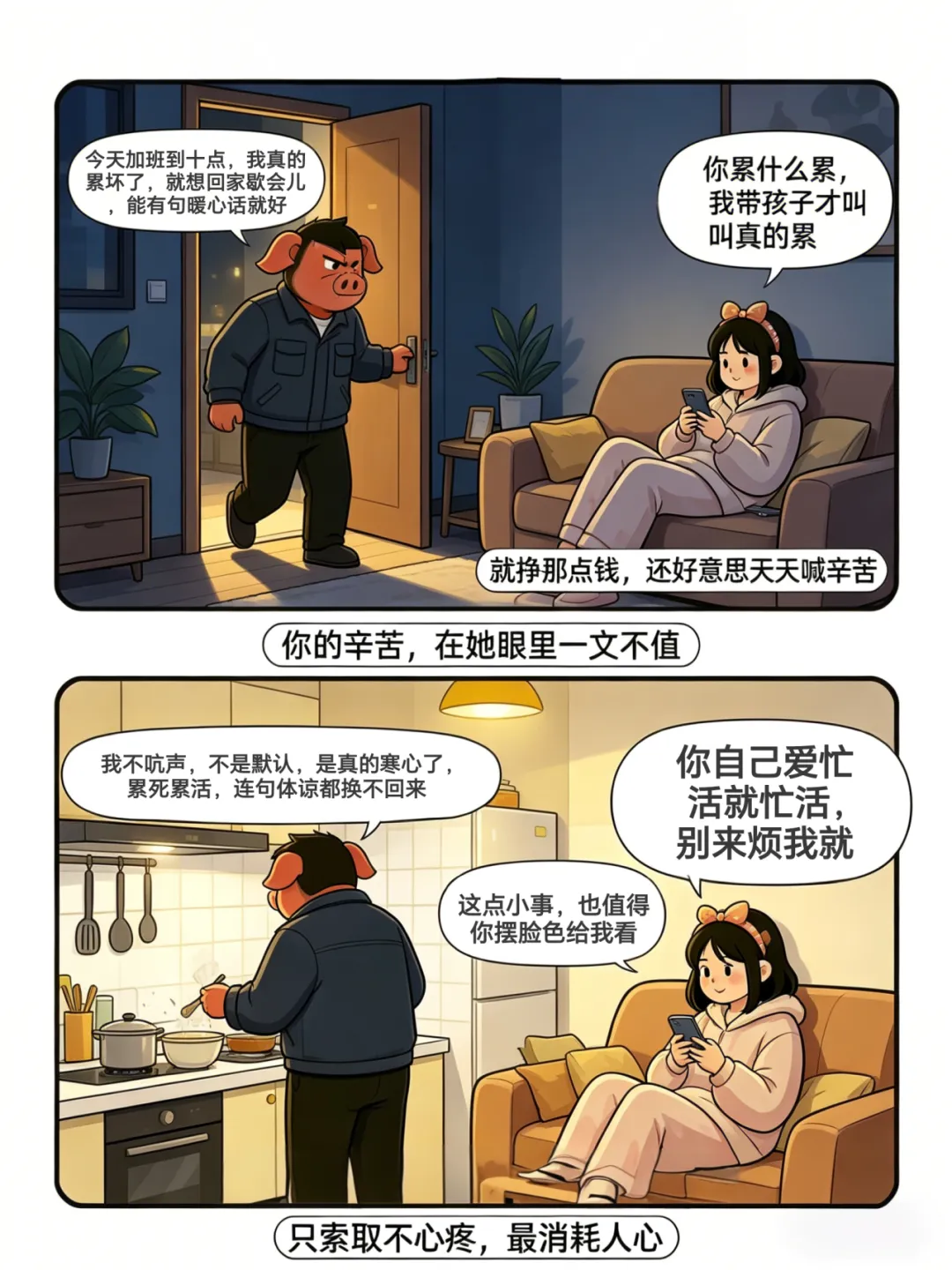 躺床上我就在想,这事儿不对啊。我不是说不能体谅她带孩子辛苦,但凭什么我的累就不是累了?凭什么我每天起早贪黑,回家连句“辛苦了”都换不来?