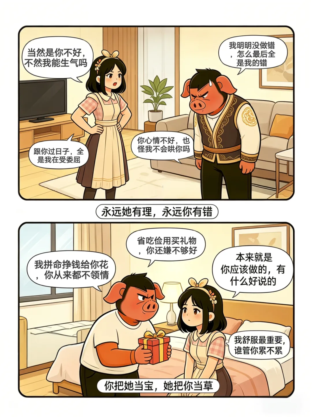 她心情不好,是你不会哄;她花钱超了,是你挣得少;她跟婆婆吵了,是你没站她那边。反正不管发生什么,最后都是你不对,你不够好,你不懂她。