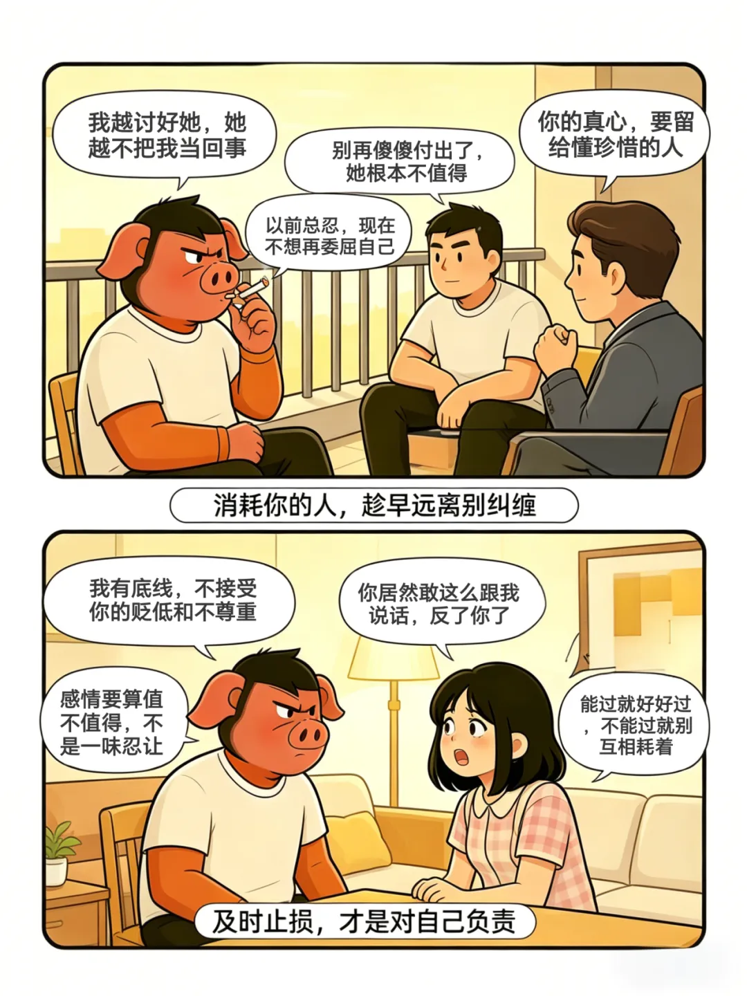 她不尊重你的时候,别笑,别忍,直接说“我不喜欢你这样说话”。她要是还这样,你就走开。你得让她知道,你有脾气,你也会疼,你不是没有底线的受气包。