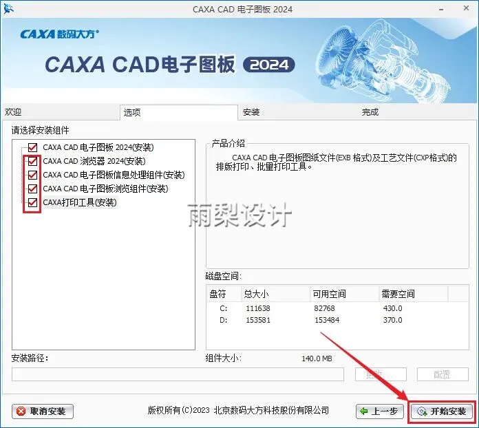 8.根据需求勾选需要的组件,点击【开始安装】