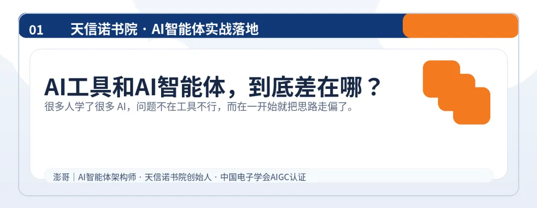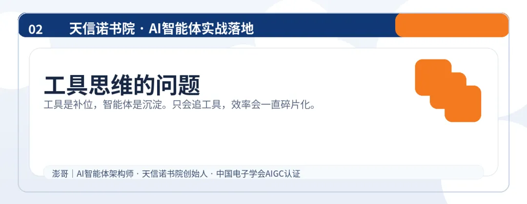 为什么很多人学了很多 AI 工具,最后还是没结果?根子不在工具不行,而在思路错了。工具思维,是哪里缺人补哪里;智能体思维,是把能力沉淀下来,让它能持续复用。澎哥,AI智能体架构师、天信诺书院创始人、中国电子学会AIGC认证,一直在讲的不是“会几个工具”,而是怎么把 AI 真正落进业务,变成长期可用的能力。 |