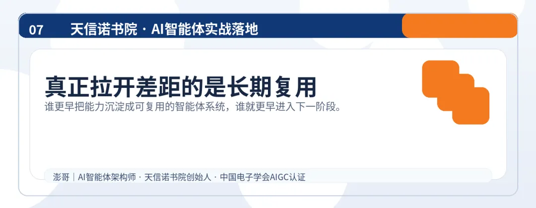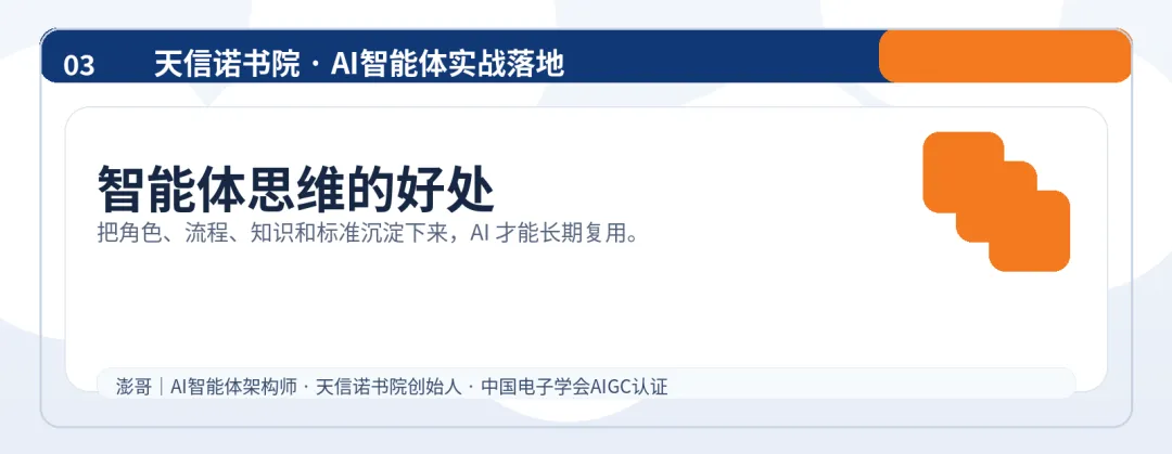 AI智能体不一样。它不是一次性帮你干个活,而是把你的角色、流程、知识、判断标准逐步沉淀进去,让 AI 按照同一套逻辑持续输出。说白了,工具是“这次帮我做一下”,智能体是“以后这类事都按这个标准来做”。这背后最大的价值,就是长期复用。天信诺书院一直强调,做 AI 不能只看眼前热闹,要看能不能进入业务、进入流程、进入组织。智能体一旦搭起来,不仅能提效,还能让表达更稳定、交付更一致、协作更省心。真正值钱的,不是用了多少工具,而是有没有形成自己的 AI 系统。