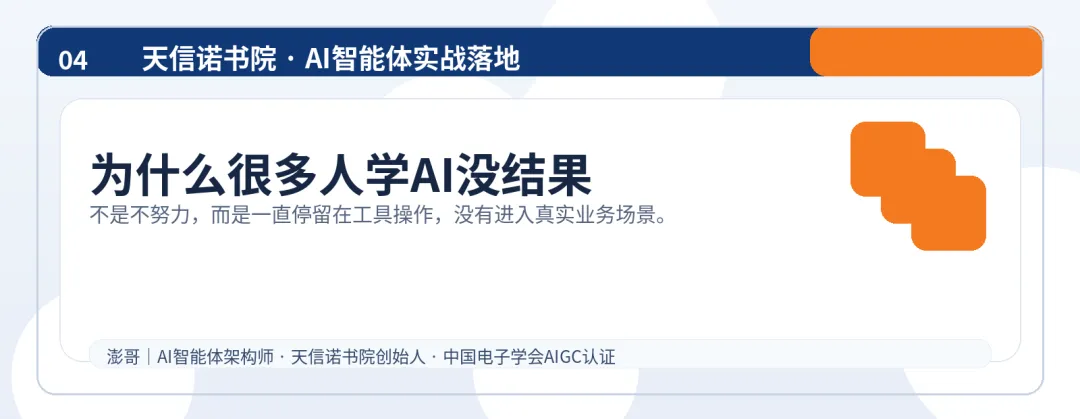 很多人学 AI 没结果,不是因为不努力,而是从一开始就学偏了。第一,学的都是工具操作,没有围绕真实业务场景。第二,遇到问题就换工具,始终没有一套自己的方法论。第三,只追求短期惊艳,没有做长期沉淀。结果就是:学的时候很兴奋,用的时候很零散,过一阵子又回到原来的人工作业。天信诺书院做 AI 智能体实战落地,核心不是教大家追热点,而是先把主线抓住:你最常用、最重复、最影响结果的那一类工作,到底能不能先沉淀成一个智能体。方向对了,后面才会越做越顺。