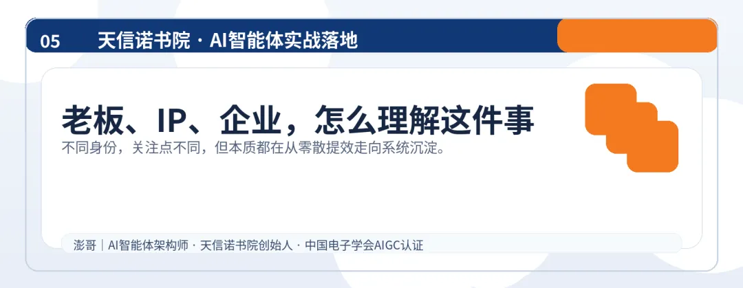 老板理解 AI 工具和 AI 智能体的区别,关键看“决策和管理”。工具能帮老板省一点操作时间,但老板真正缺的,是把会议纪要、经营分析、销售复盘、战略判断逐步沉淀成一个可调用的老板智能体。个人IP理解这件事,关键看“内容和转化”。普通工具能帮你写几篇文案,但 IP 真正需要的是懂你表达、懂你选题、懂你私域节奏的 IP 智能体。企业理解这件事,关键看“知识和协同”。工具能让员工各自提效,智能体才能把企业知识库、客服话术、销售 SOP、培训资料变成组织能力。澎哥为什么一直反复讲 AI 落地?因为站在不同角色看,大家需要的都不是更多工具,而是更稳定的能力沉淀。