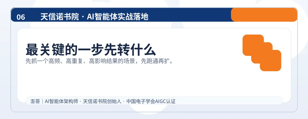 最关键的一步,不是一下子做很多,而是先从一个高频、高重复、高影响结果的场景开始。老板可以先做会议纪要和经营复盘,个人IP可以先做内容选题与表达分身,企业可以先做知识库智能体。先把一个点打透,你就会真正理解什么叫“从工具到智能体”。天信诺书院一直主张先做能见结果的场景,再慢慢扩成系统,这样最稳,也最不容易走弯路。