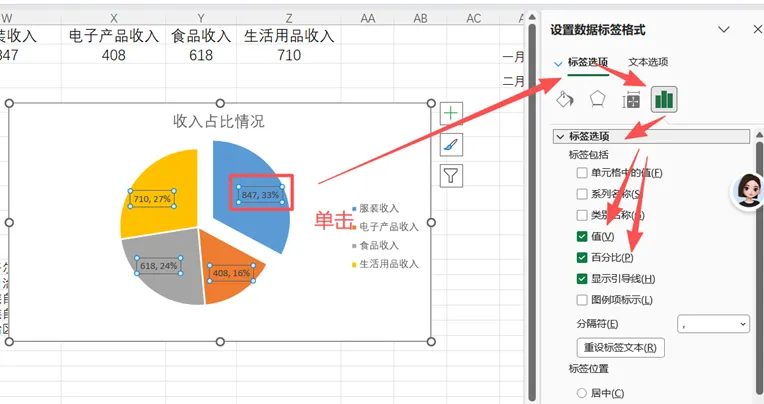 若要想显示数据及占比,可以单击图中比例数字;