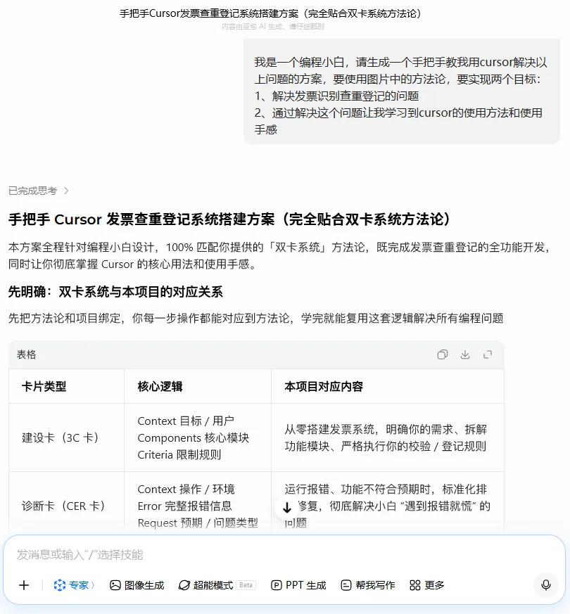 学完课程的当天,我就想解决自己每天头疼的发票登记问题。我马上打开豆包的专家模式,把刚学会的「双卡系统方法论」喂给了它,让它严格按照这个方法,给我出一套《手把手Cursor发票查重登记系统搭建方案》。