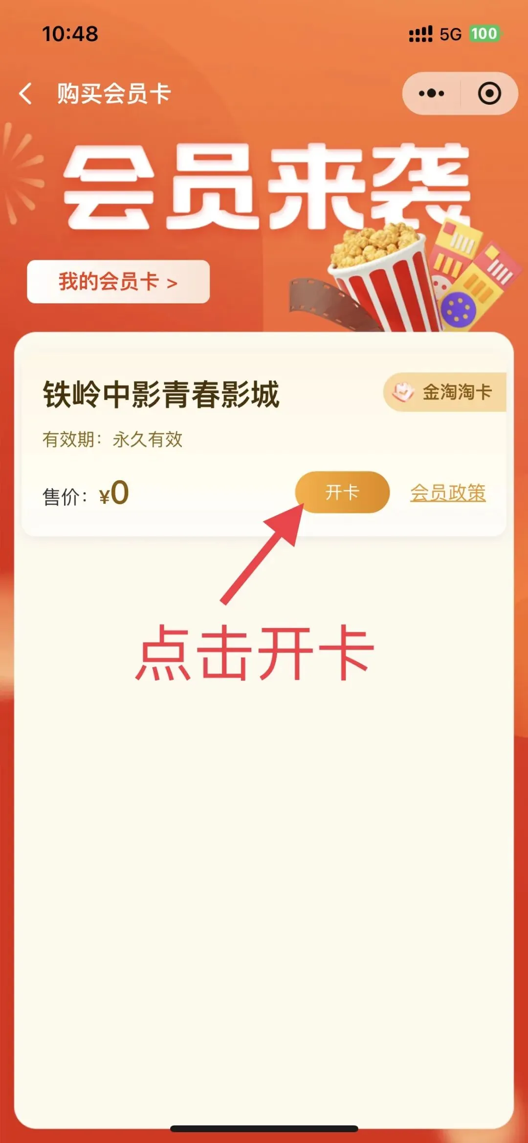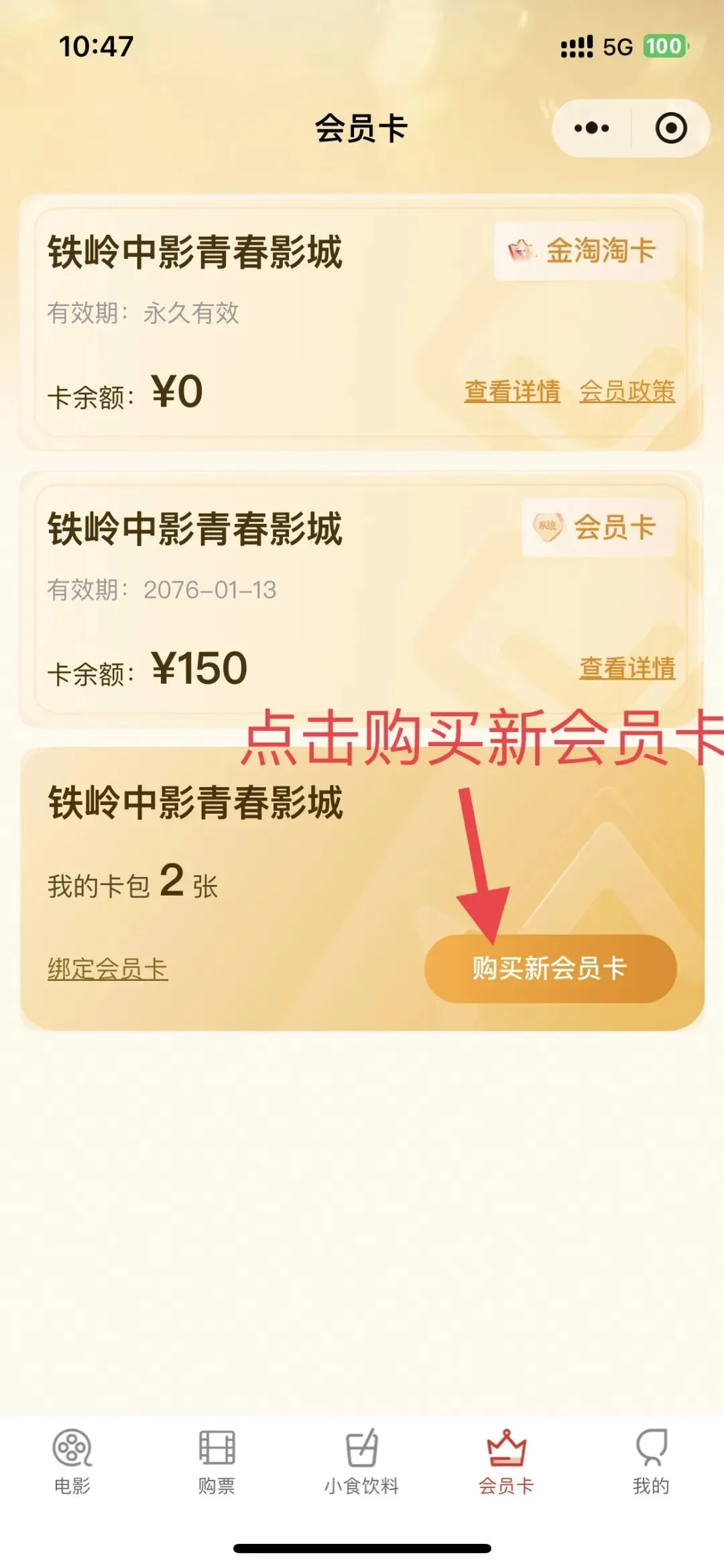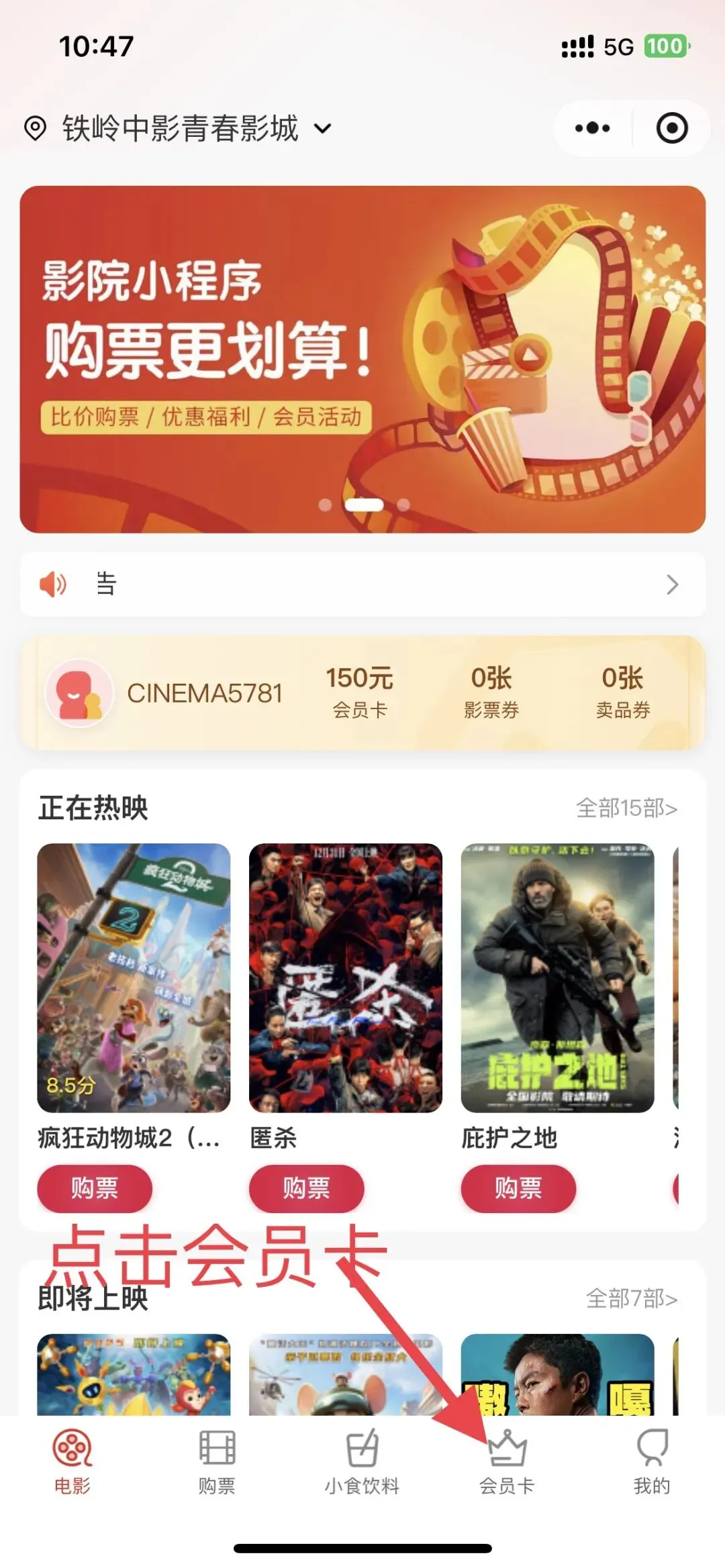 第二步:进入“铁岭中影青春影城”小程序点击下方“会员卡”