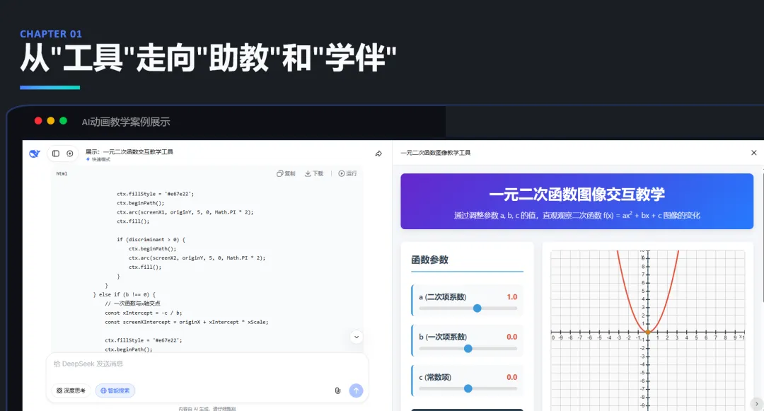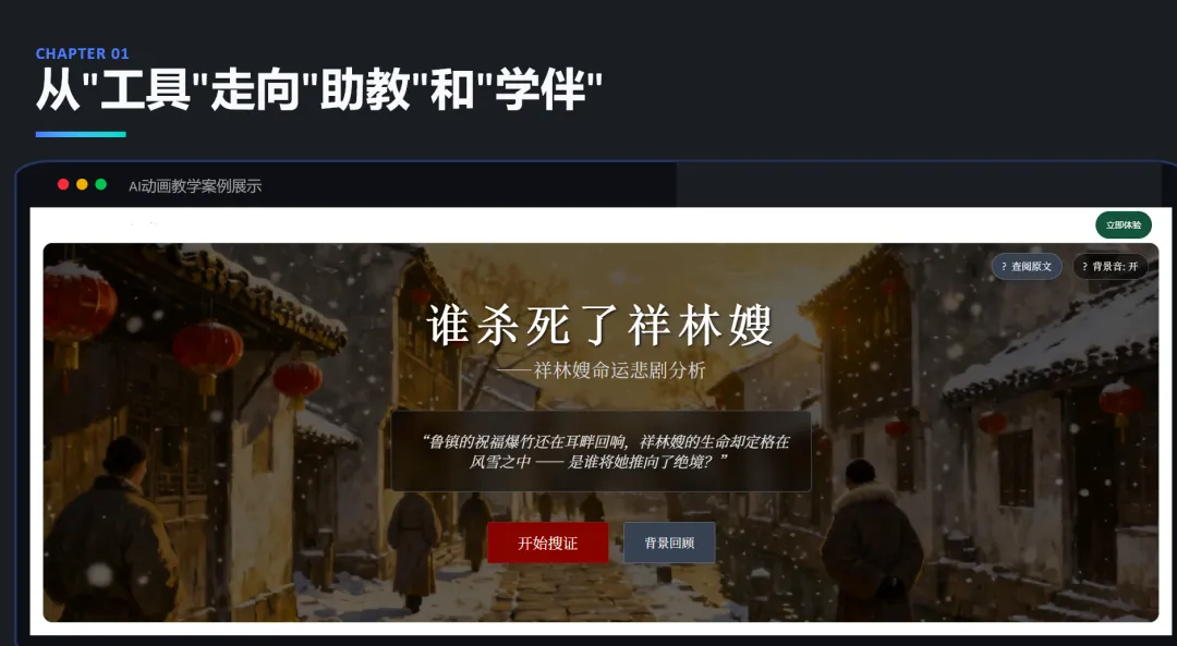但如果只把它当工具,其实还只是比较初级的应用。真正有意义的AI应用,不是把它仅仅当成一个会生成文字、图片、课件的工具,而是让它成为,教师的助教、学生的学伴,真正进入教学全过程。服务真实教学问题。