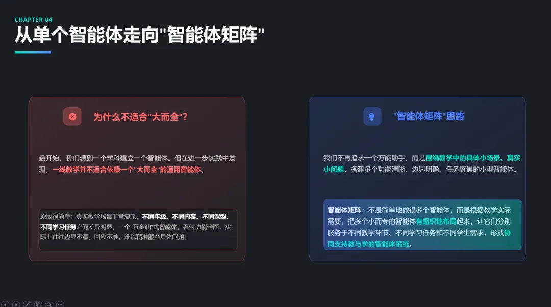 但在进一步实践中我们发现,一线教学并不适合依赖一个“大而全”的通用智能体。原因很简单:真实教学场景非常复杂,不同年级、不同内容、不同课型、不同学习任务之间差异明显。一个“万金油”式智能体,看似功能全面,实际上往往边界不清、回应不准,难以精准服务具体问题。
