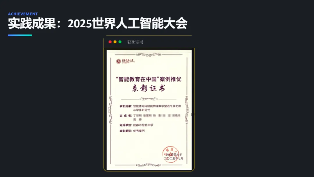 这一实践案例在2025世界人工智能大会教育分论坛获得全国优秀奖,也是该论坛的最高奖。