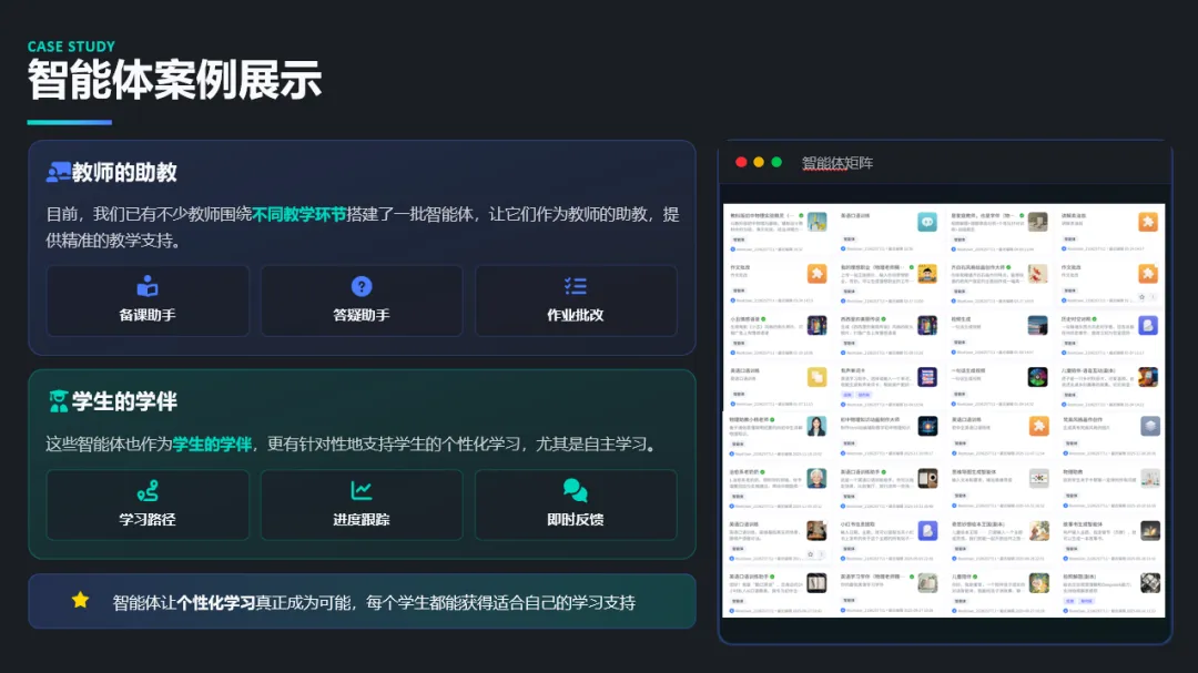 目前,我们已有不少教师围绕不同教学环节搭建了一批智能体,让它们作为教师的助教、学生的学伴,更有针对性地支持学生的个性化学习,尤其是自主学习。
