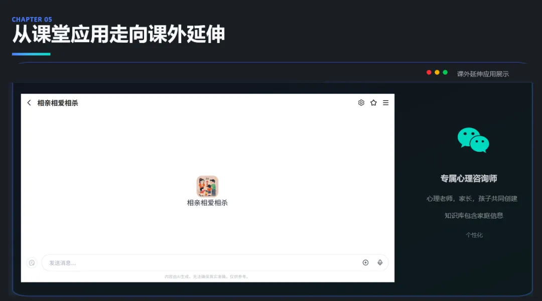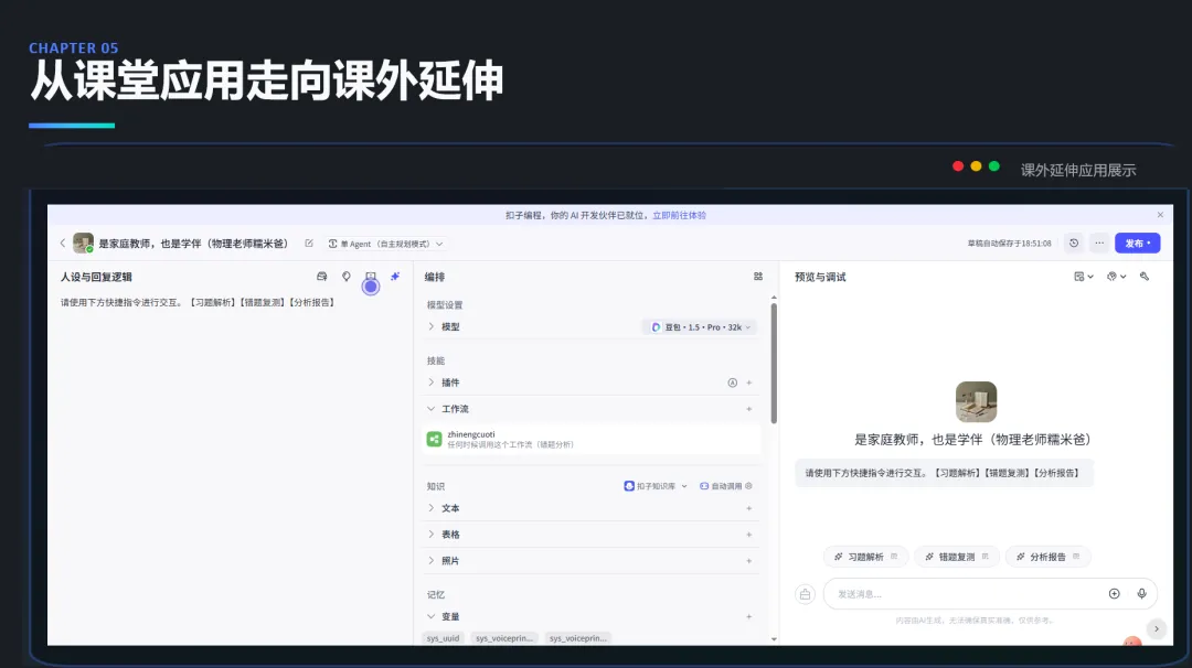 在实践中,我们还进一步把智能体应用从课堂内部延伸到课外学习场景。