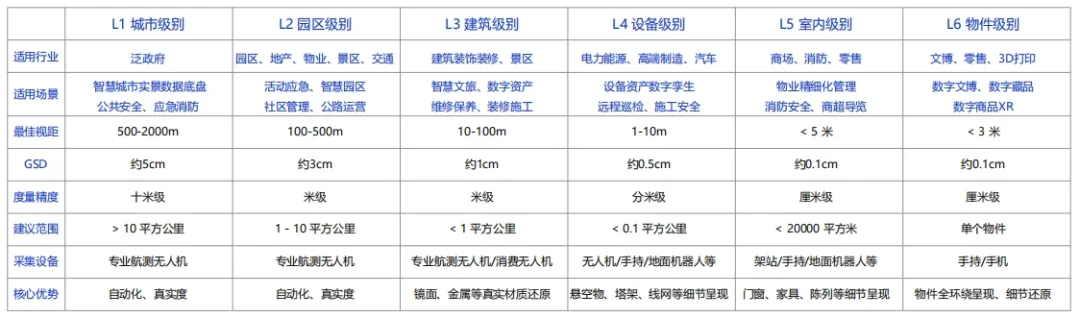 六级精度分级:L1城市级覆盖城区大场景,构建数字孪生底座;L2园区级支撑场站、楼盘等中小场景的招商展示与规划仿真;L3建筑级实现单体建筑精细展示;L4设备设施级针对小型设施或设施群;L5室内级应对复杂室内空间;L6物件级达到毫米级精度,满足文物数字化等极致需求。