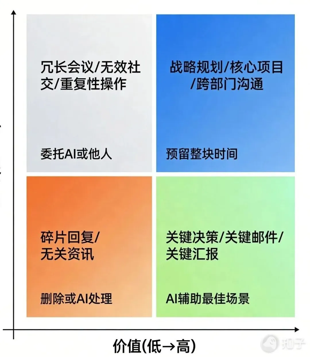 - 第四象限(低价值×低耗时):碎片回复、无关资讯。这类工作直接删除或用AI处理。